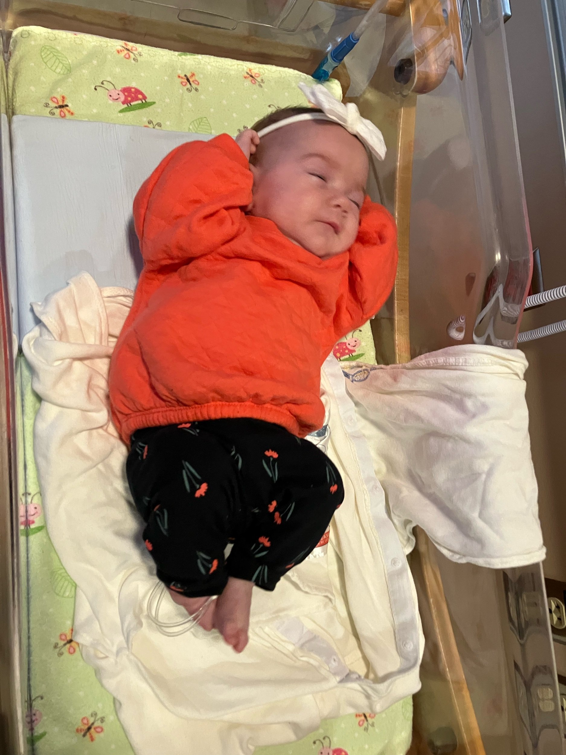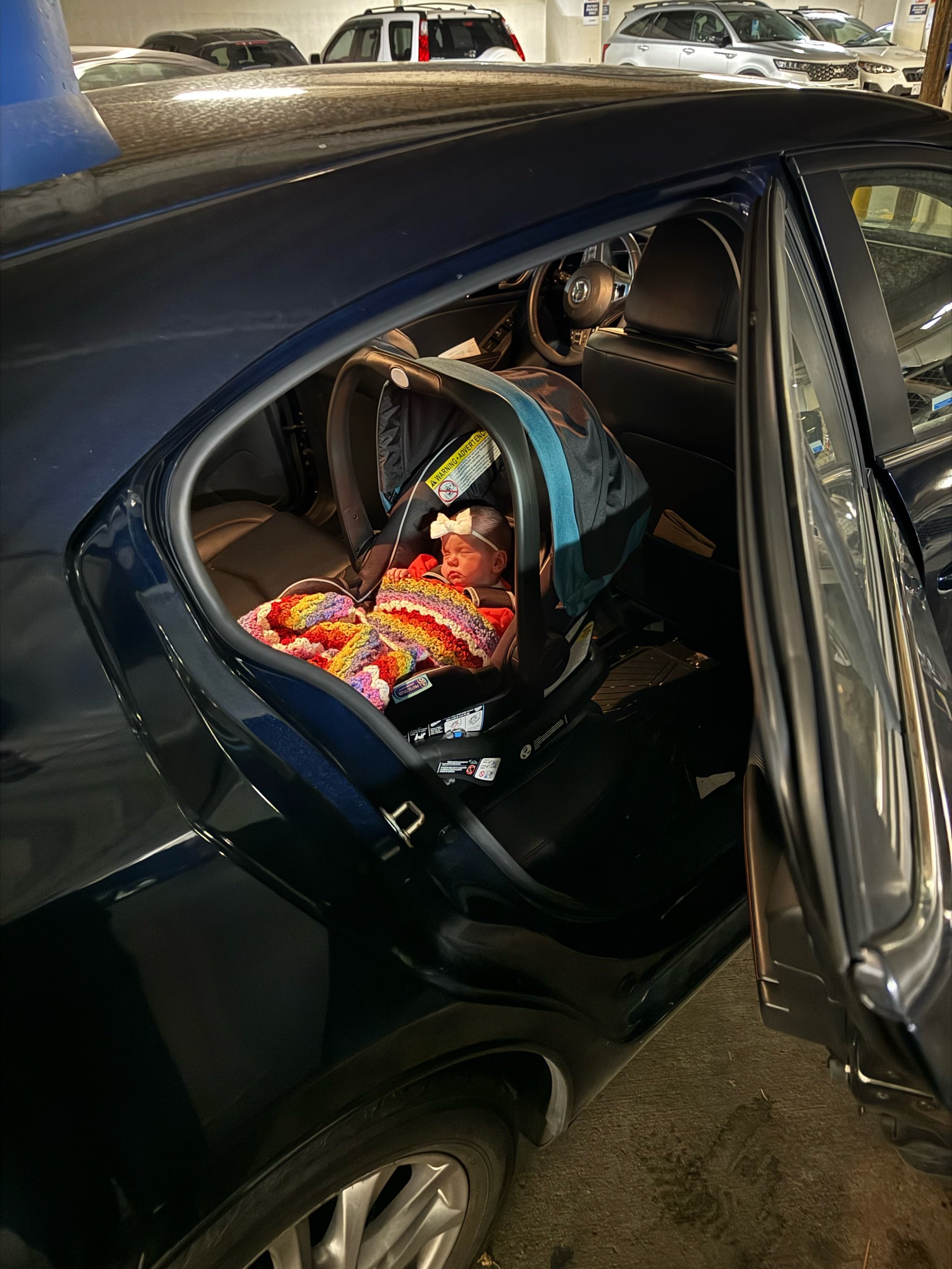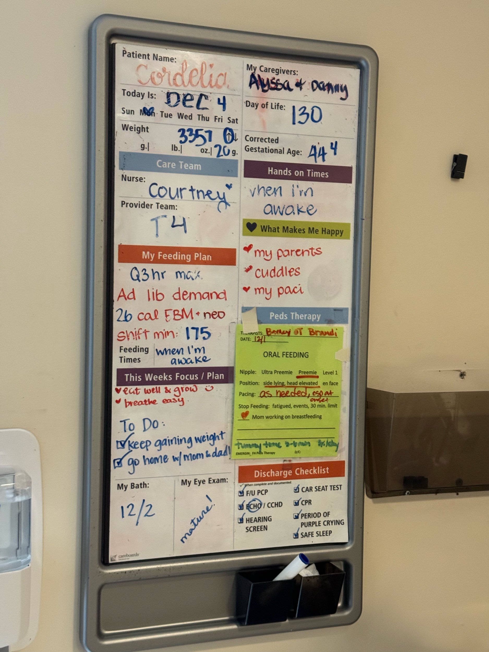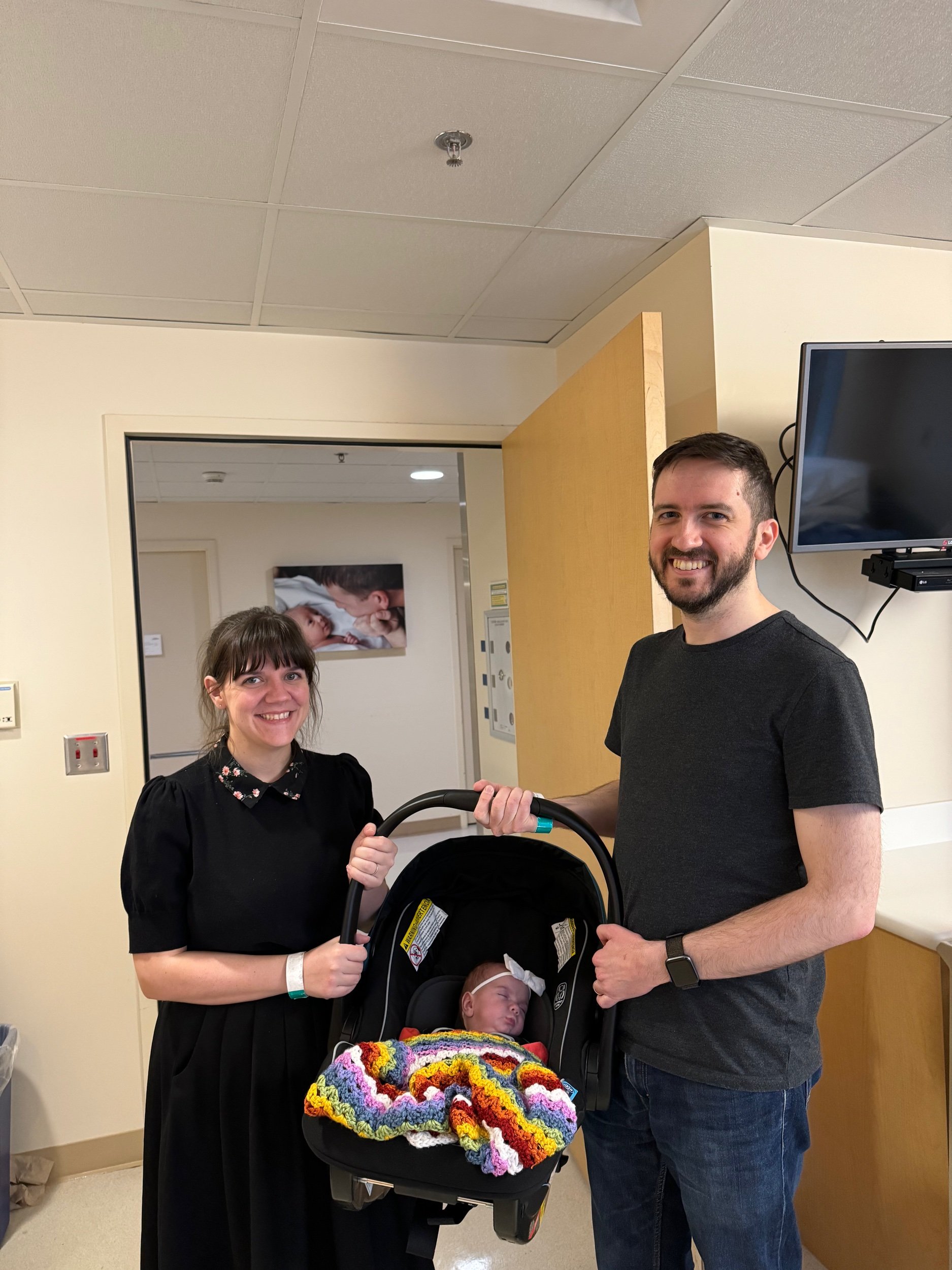 Last night we “roomed in” at the hospital, staying overnight in anticipation of Cordelia’s discharge today. We took care of her all night, feeding, diapering, and attempting to get her to sleep. Then this morning she was officially cleared for discharge! She was disconnected from her monitors, and they let us walk out of the NICU and the hospital with her!