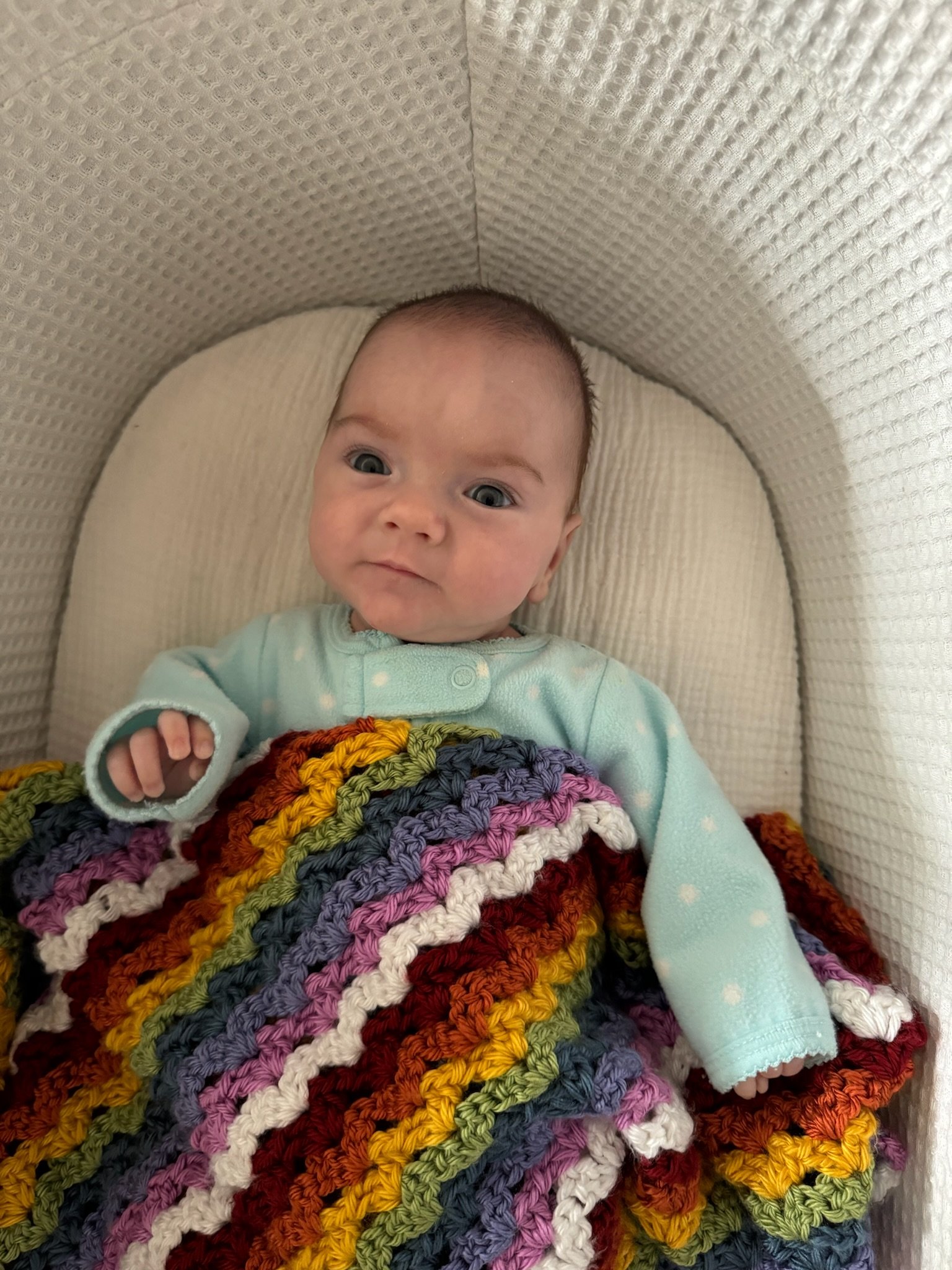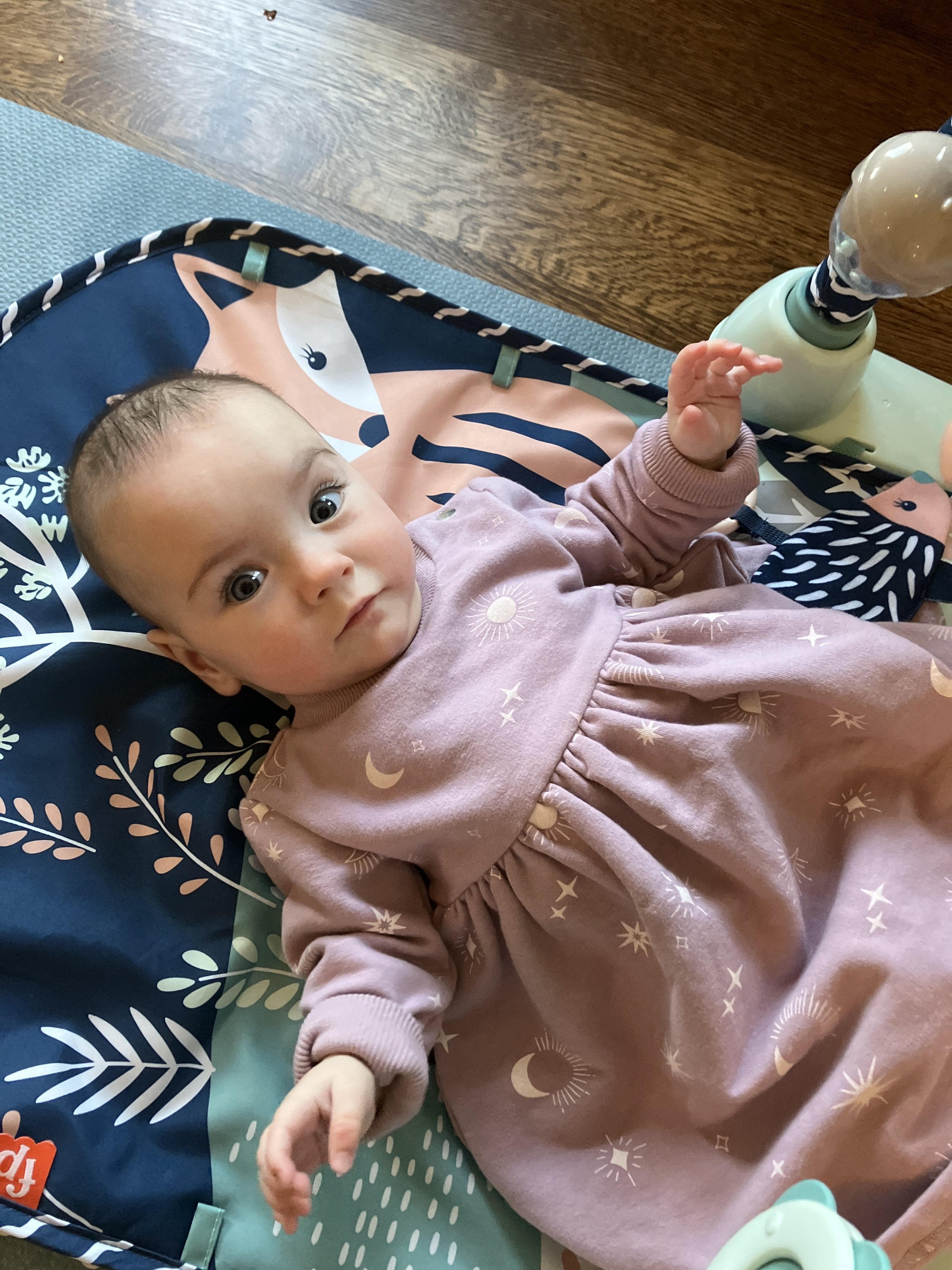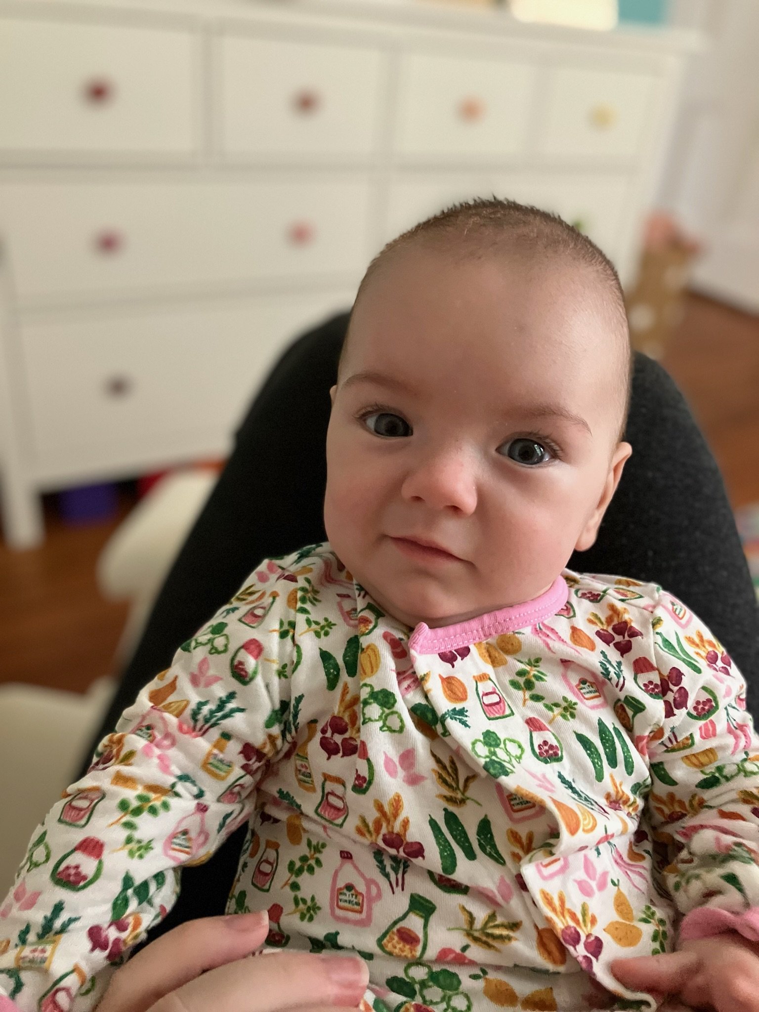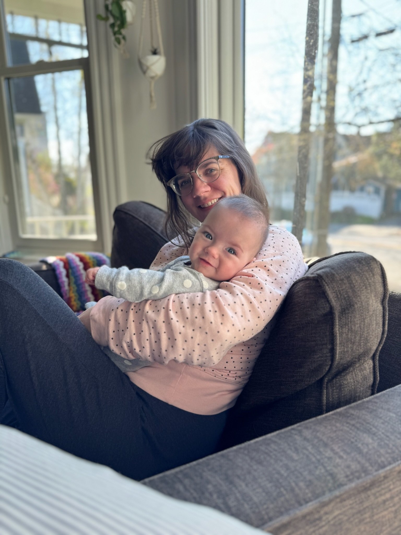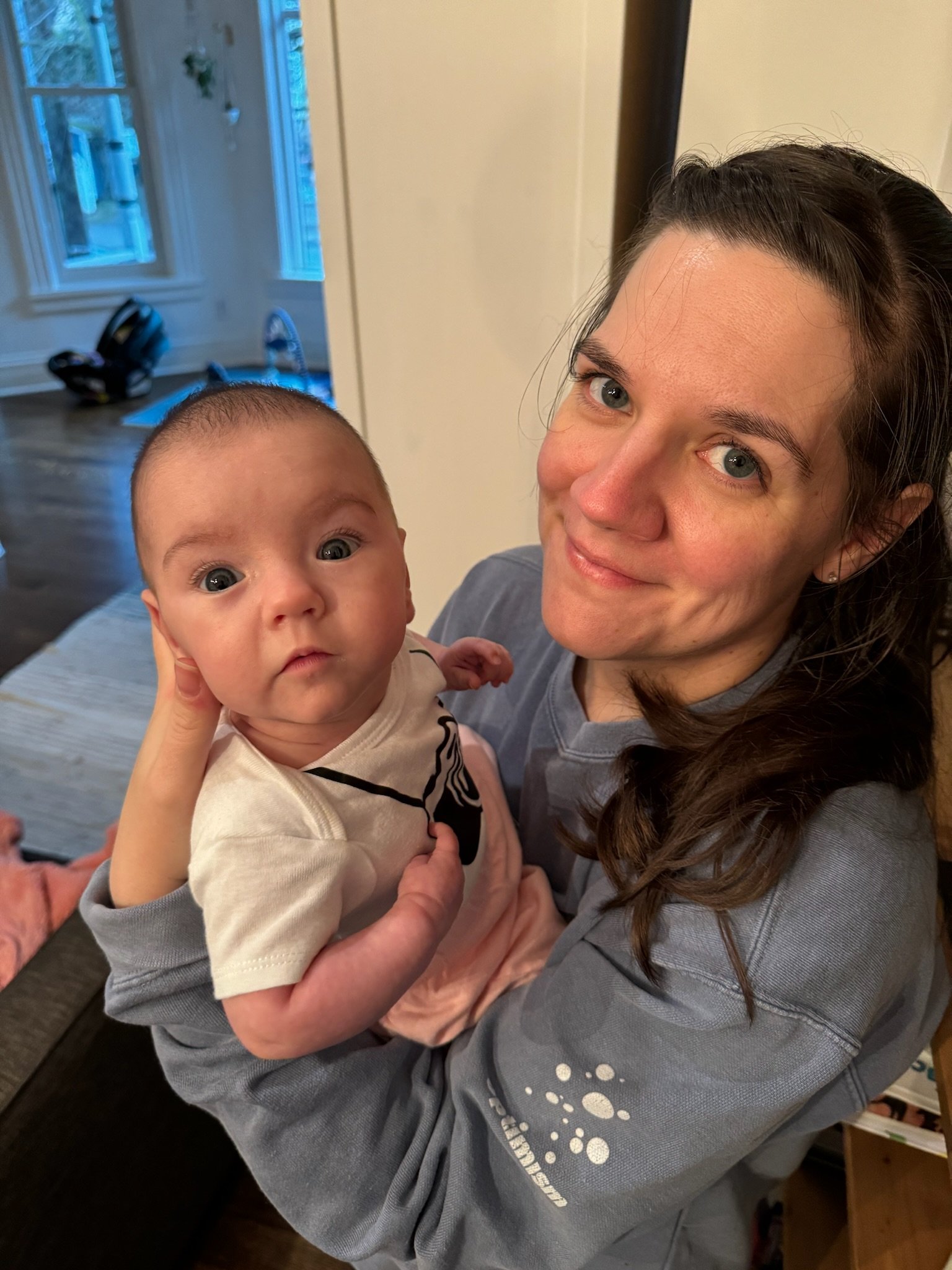 As of today, we’ve officially had Cordelia home for as many days as she was in the NICU! She is now over 11lbs 10oz and 23 inches. She babbles and laughs and is trying to roll over. She loves people and will stare at whoever is talking and smile at them when they look her in the eyes. Every week she learns to make a new sound with her mouth. She is in a nanny share with another 5 month old who lives in our neighborhood and she has had several playdates with other 2023 babies. She sleeps quite well at night, usually waking us only once or twice. She is slowly learning to fall asleep in her crib for naps without needing to be inordinately held and rocked first.