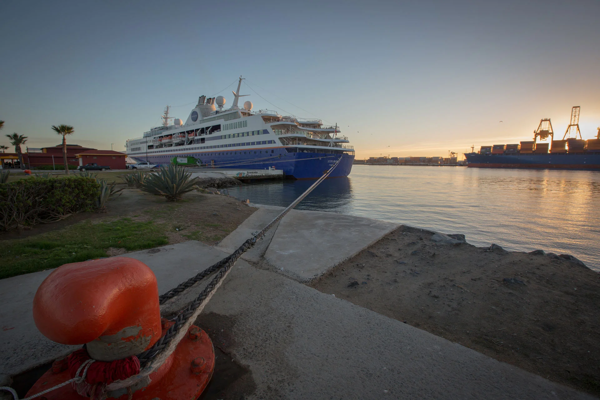 Waking up the next morning to shoot the sunrise, I discovered we had been magically transported to Mexico overnight. It was a beautiful experience to see the light come up from darkness over the harbour and hills of Ensenada. When I first came up on deck there was even a sliver of moon right at the point on the horizon where the sun was about to rise.